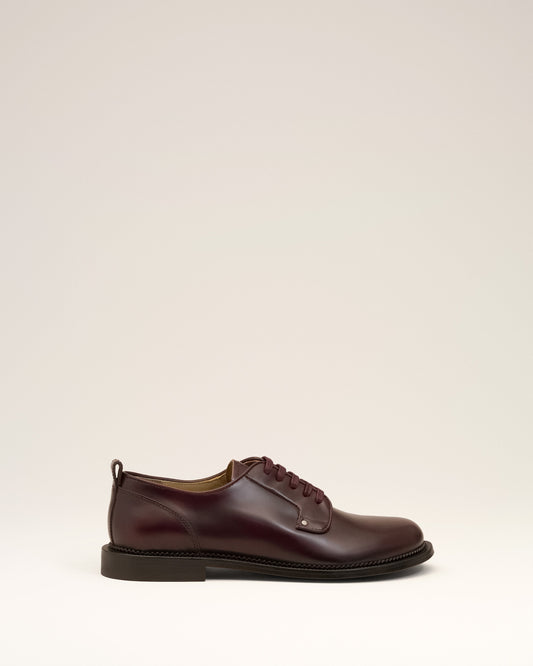 Anatomical toe lace up derbies in glazed leather. Calfskin Leather sole Anti slip insert in...