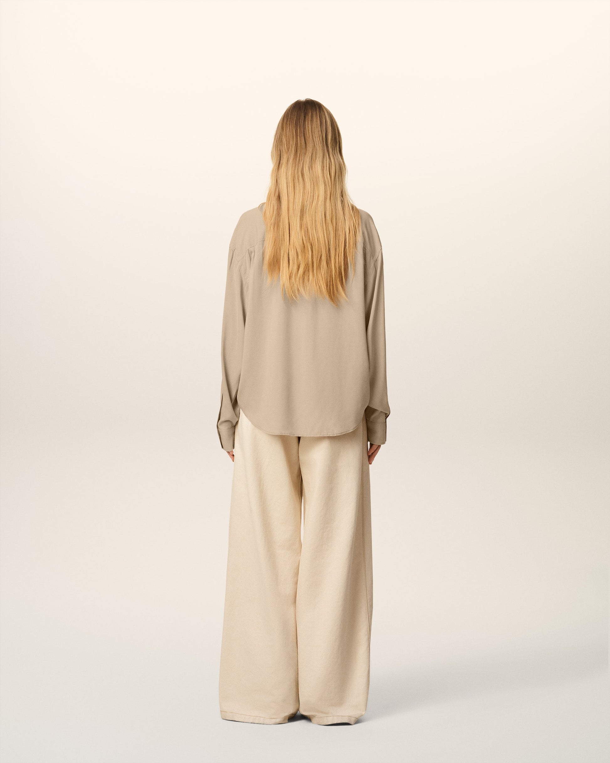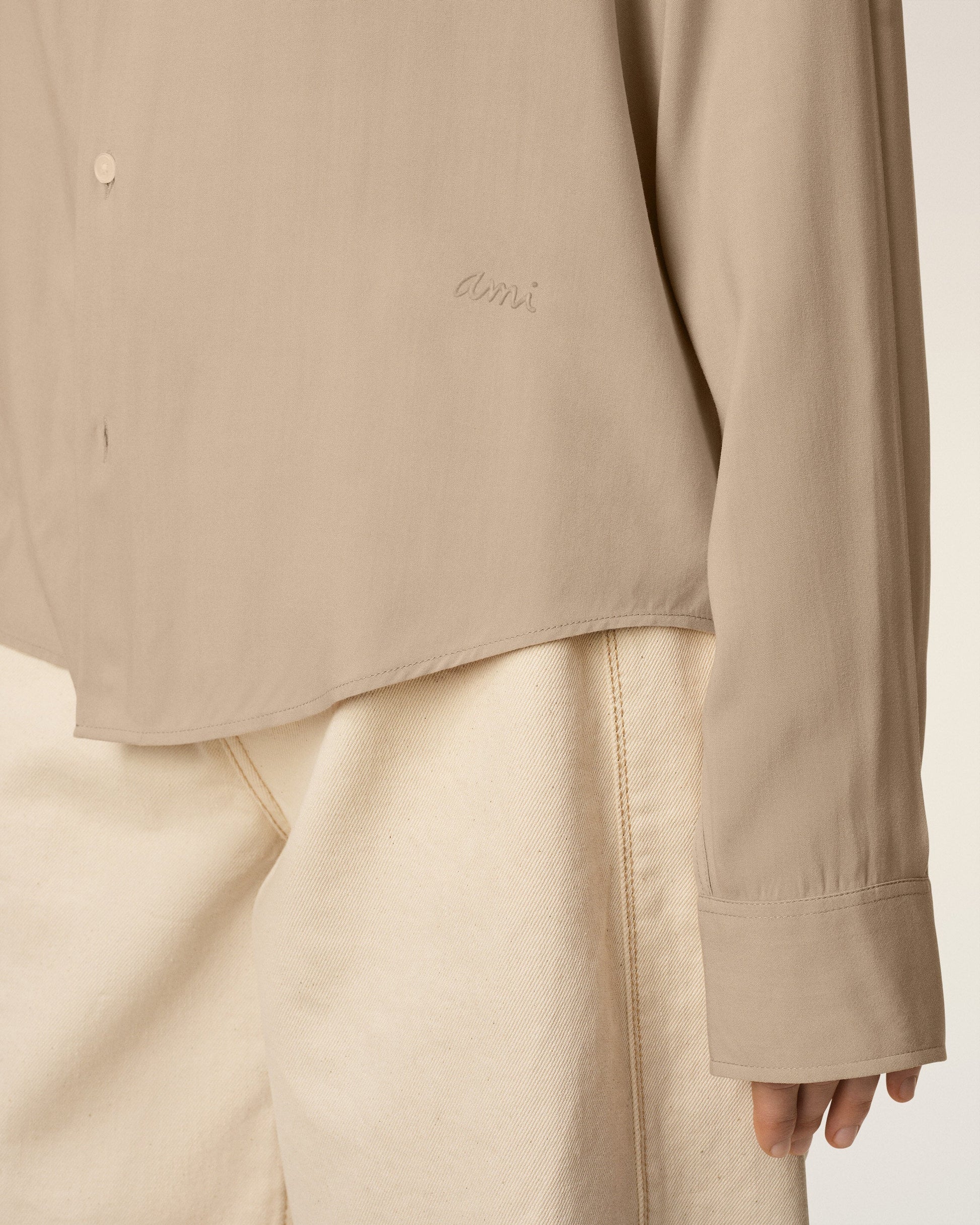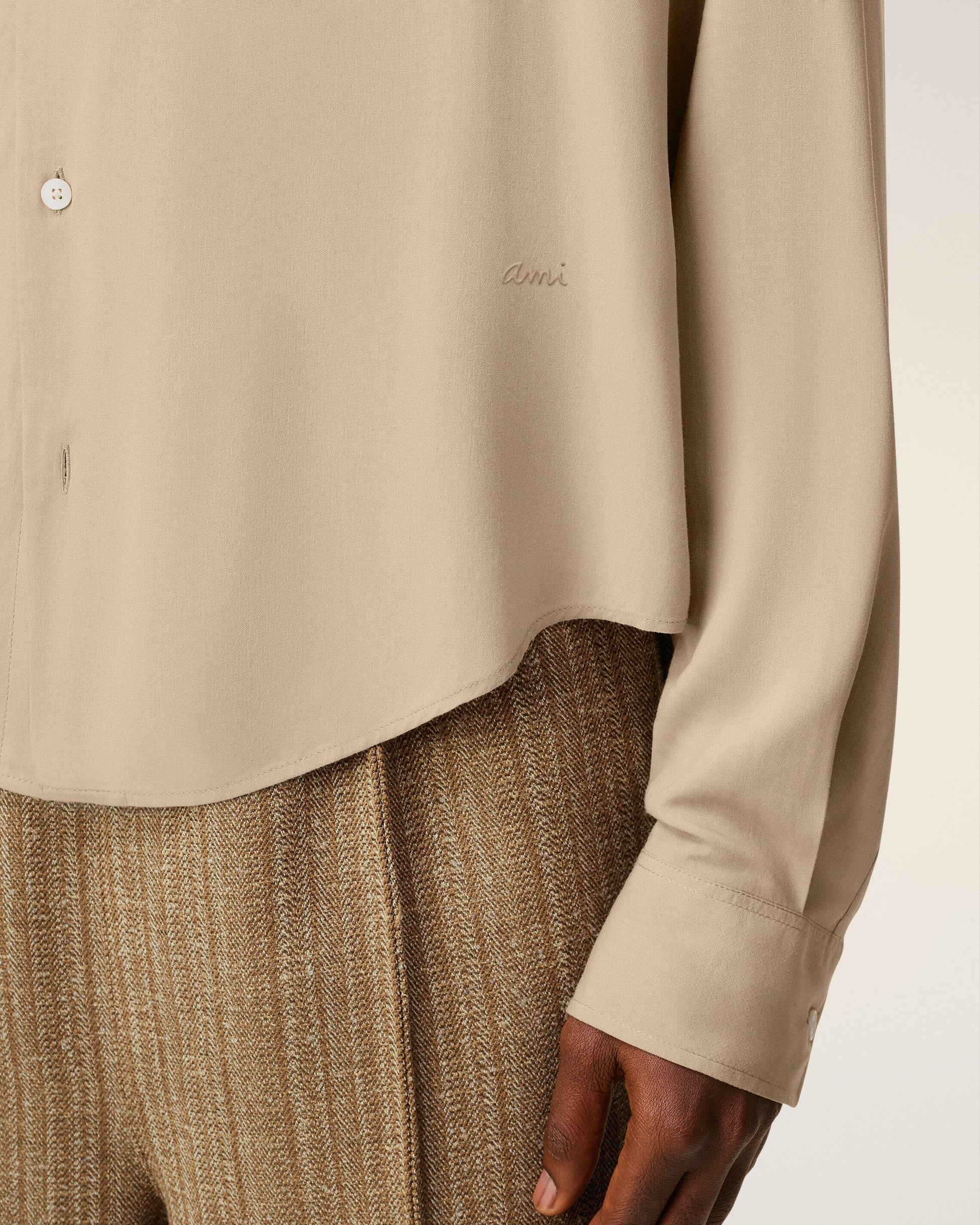 Plain viscose shirt. Unisex product Boxy fit Classic collar Buttoned placket on the front and cuffs Mother of pearl buttons Tonal italic "ami" embroidery on bottom left waist Center back length : 72,5cm (size XS) Center back length : 74,5cm (size M) Made in Portugal (with love) REF: USH767.VI0036.229