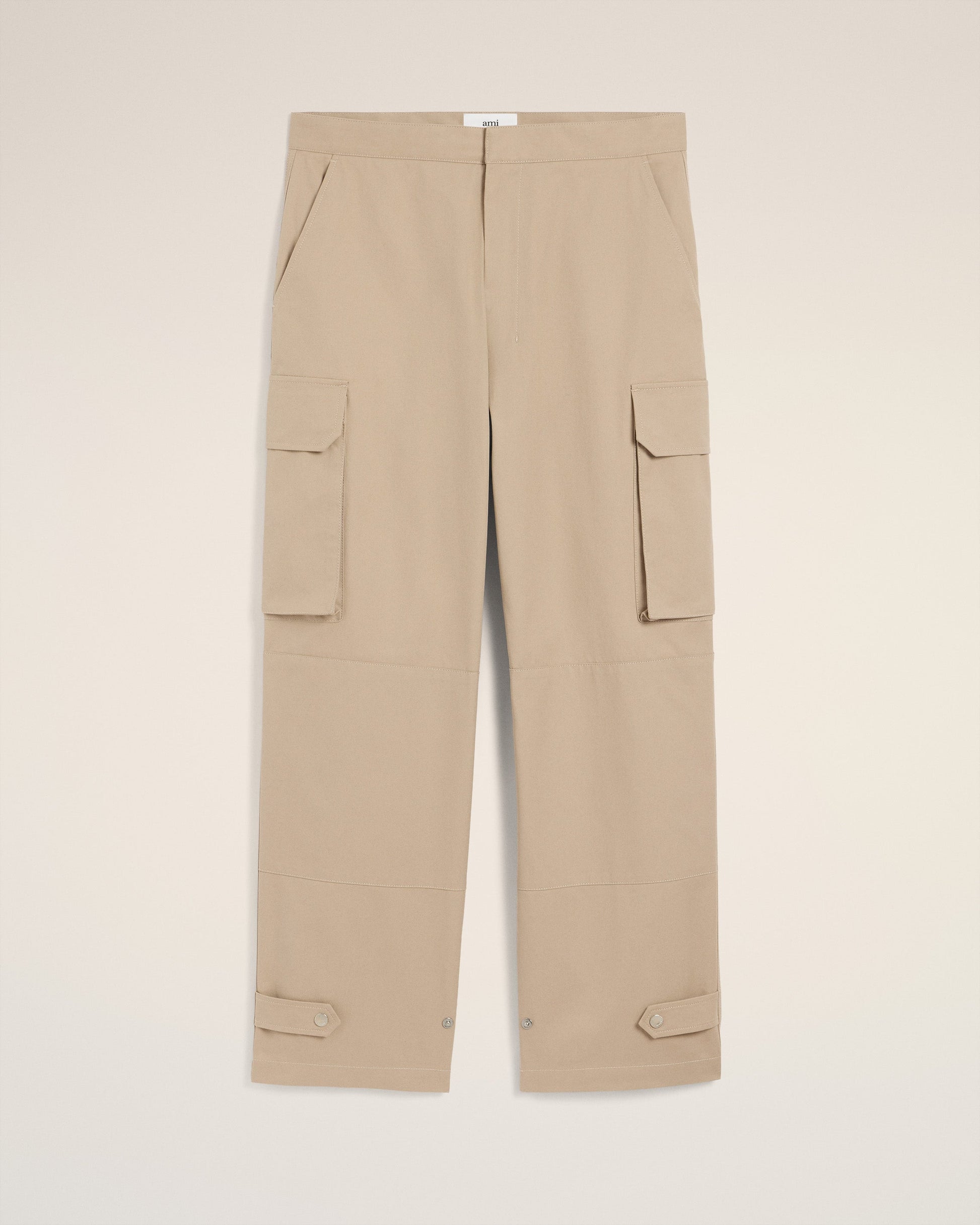 Cargo trousers in cotton gabardine. Classic waist Large leg Zipped fly Pockets with invisible snap buttons "ami alexandre mattiussi" leather label on the back Adjustable bottom legs with snap buttons Adjustable back tabs with snap buttons 27 cm bottom leg width (size M) Made in Portugal (with love) REF: HTR828.CO0132.229