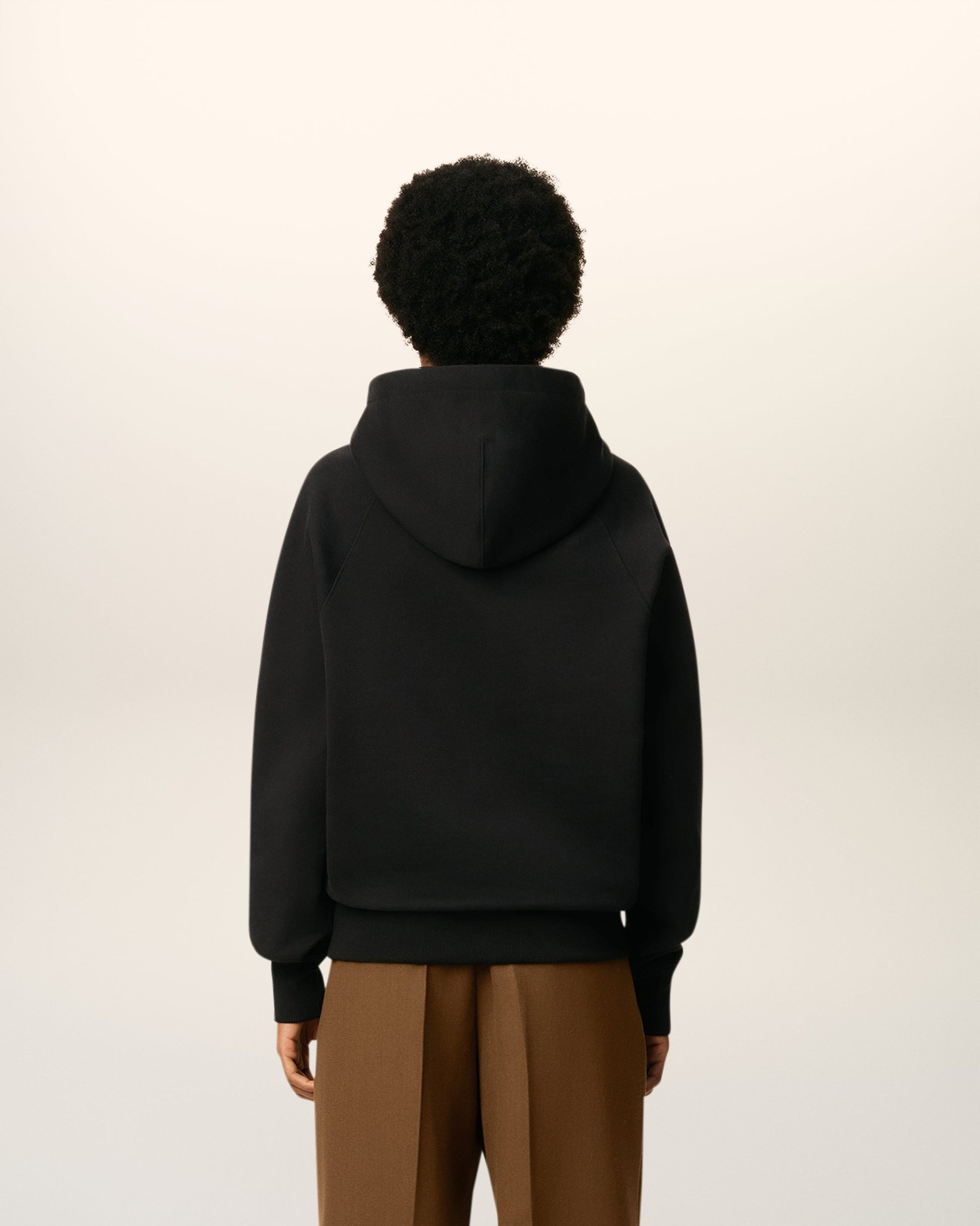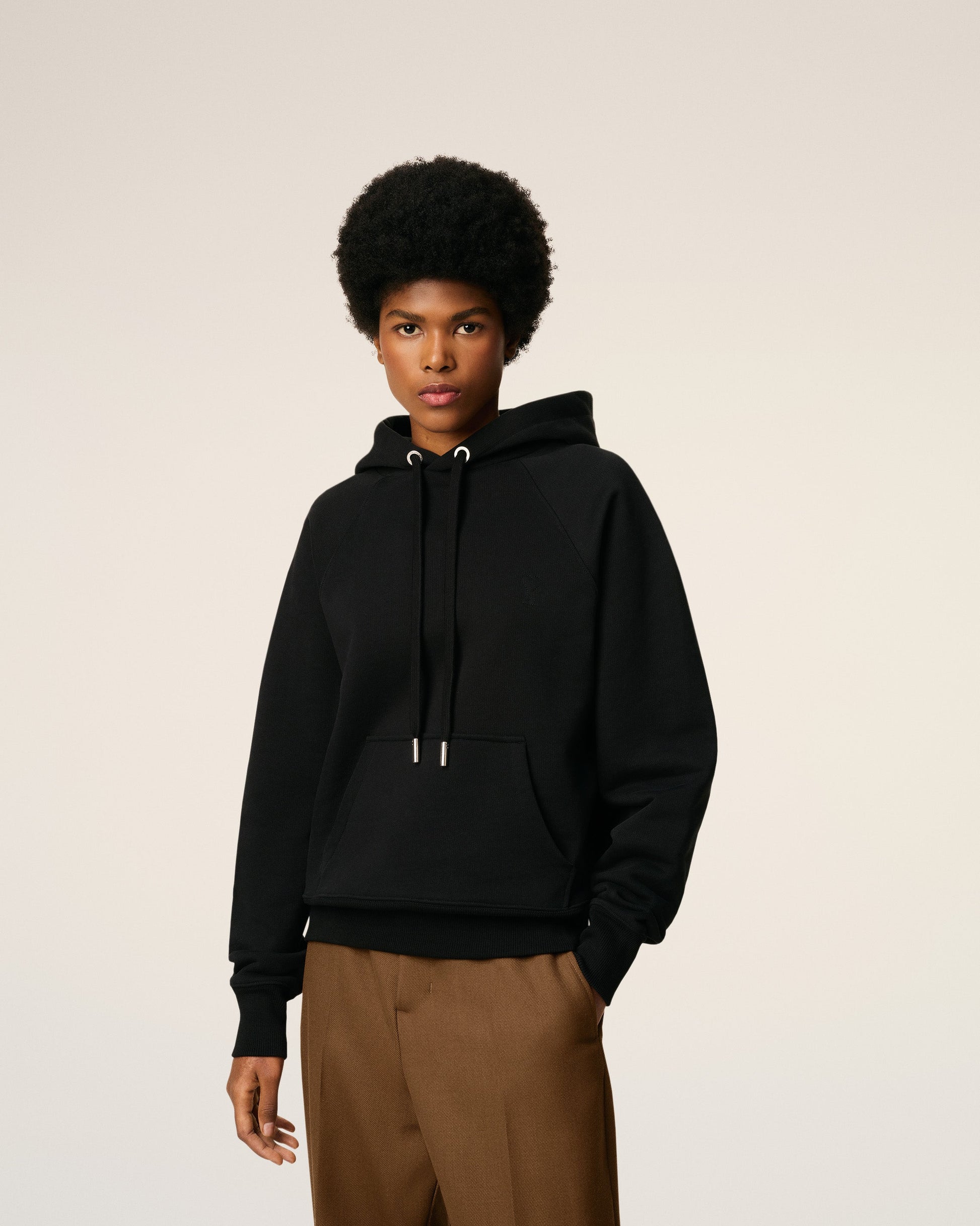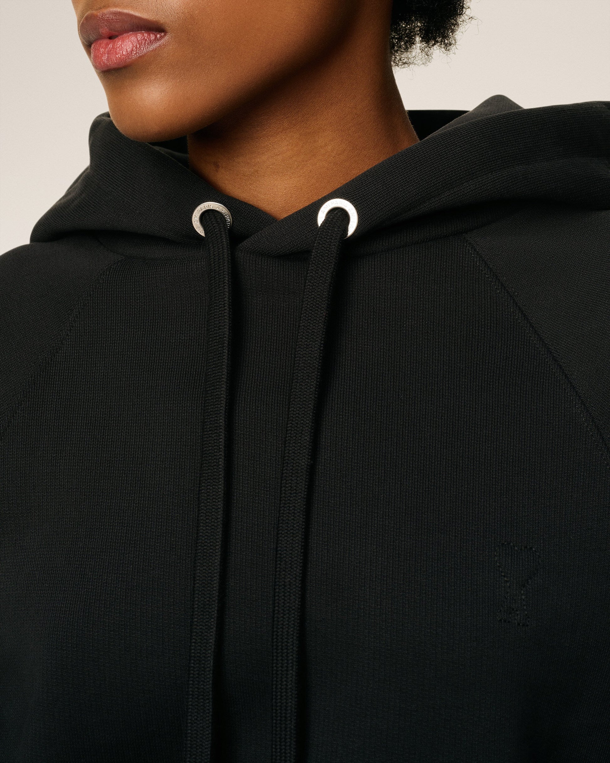 Ami de Coeur hoodie in heavy loopback cotton fleece. Unisex product Boxy fit Raglan sleeves Small embossed and topstitched Ami de Coeur on chest Tonal "ami" embroidery on the back under neckline Silver metal ends and "ami" engraved eyelets 61cm center back length (size XS) 65cm center back length (size M) Made in Portugal (with love) REF: USW758.747.001